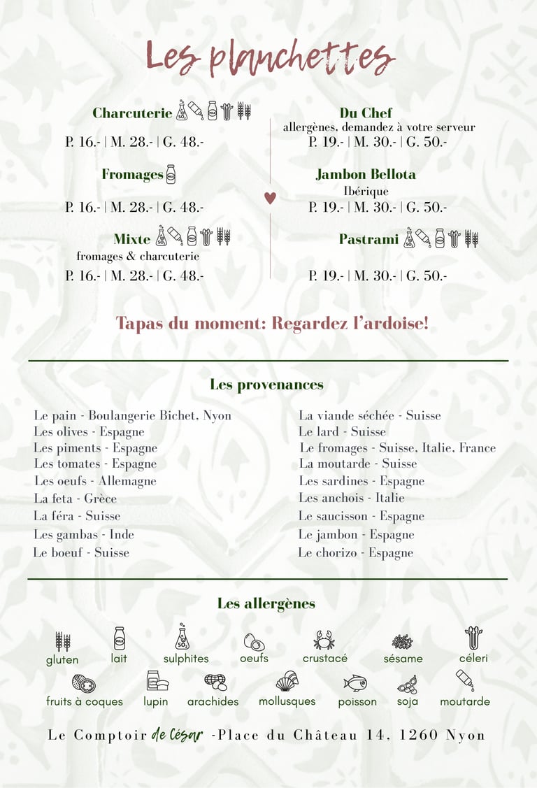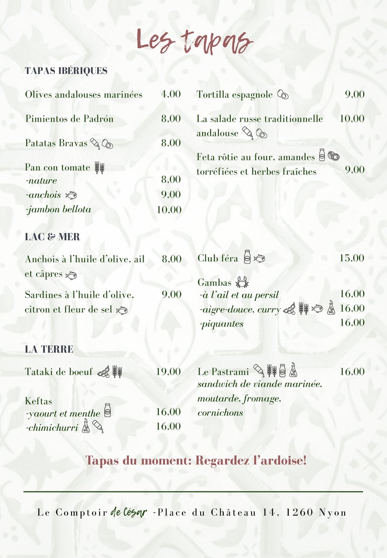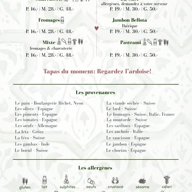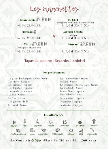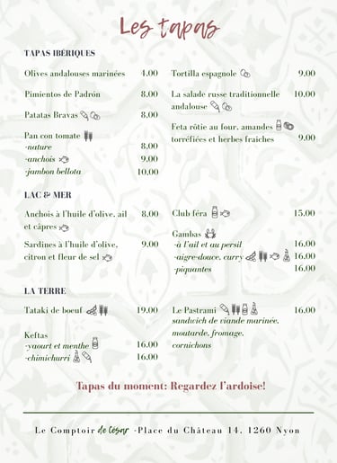 Venez découvrir notre bar à tapas à Nyon, un lieu où la convivialité s’invite à table. Chaque jour, nous vous proposons de savoureux tapas faits maison, élaborés avec soin à partir de produits locaux, pour partager un moment chaleureux et authentique.